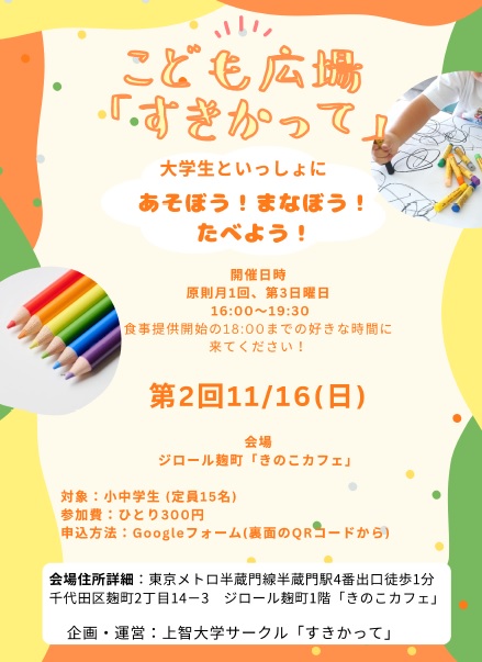 - 上智大学の学生サークルが、こどもの居場所づくりに取り組んでいます。 栄養のある食事を届けることはもちろん、 みんなで食卓を囲んで楽しく過ごす時間や、 学習支援を通して学ぶことの楽しさを伝えること、 そして安心して過ごせる居心地の良い場所を届けることを理念に活動しています。 ぜひみなさま、お立...