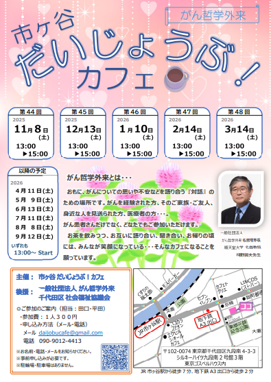 - ♢事前申込制で、ボランティアスタッフが個別でじっくり相談を伺います! 対象は千代田区在住、在勤、在学の方に限ります。 【日程】 第1、第3木曜日(こもれび千桜) 千代田区神田東松下町 22-1 第2、第4土曜日(かがやきプラザ4階 ボランティアサロン) 千代田区九段南1-6-10 かがやきプラザ4階 【時...