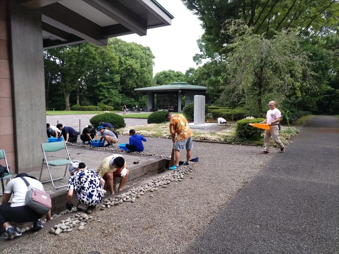 活動内容は、墓苑内の除草、側溝の玉石磨き、落ち葉掃き、敷石磨きなどを行います。